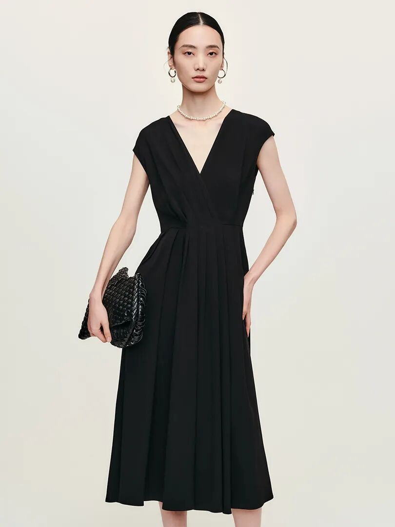 优雅藏青色大气稳重,胸前交叠设计自然形成V领,收腰巧妙修饰身型,褶皱设计增添灵动轻松。