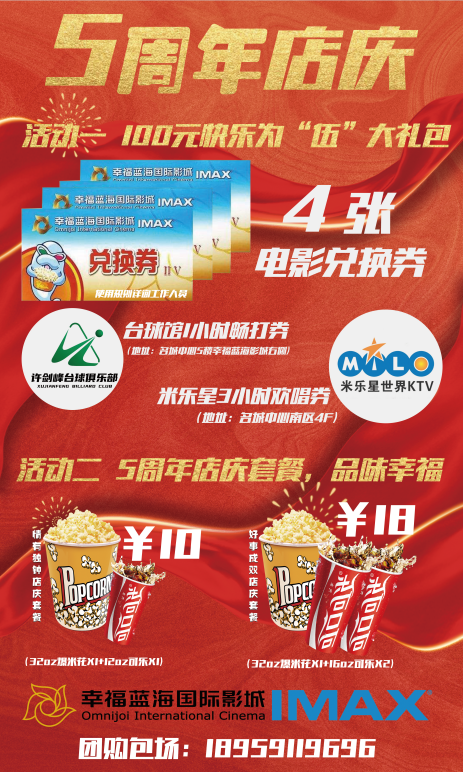 可购买100元大礼包,包含4张电影票,一张米乐星3小时欢唱券