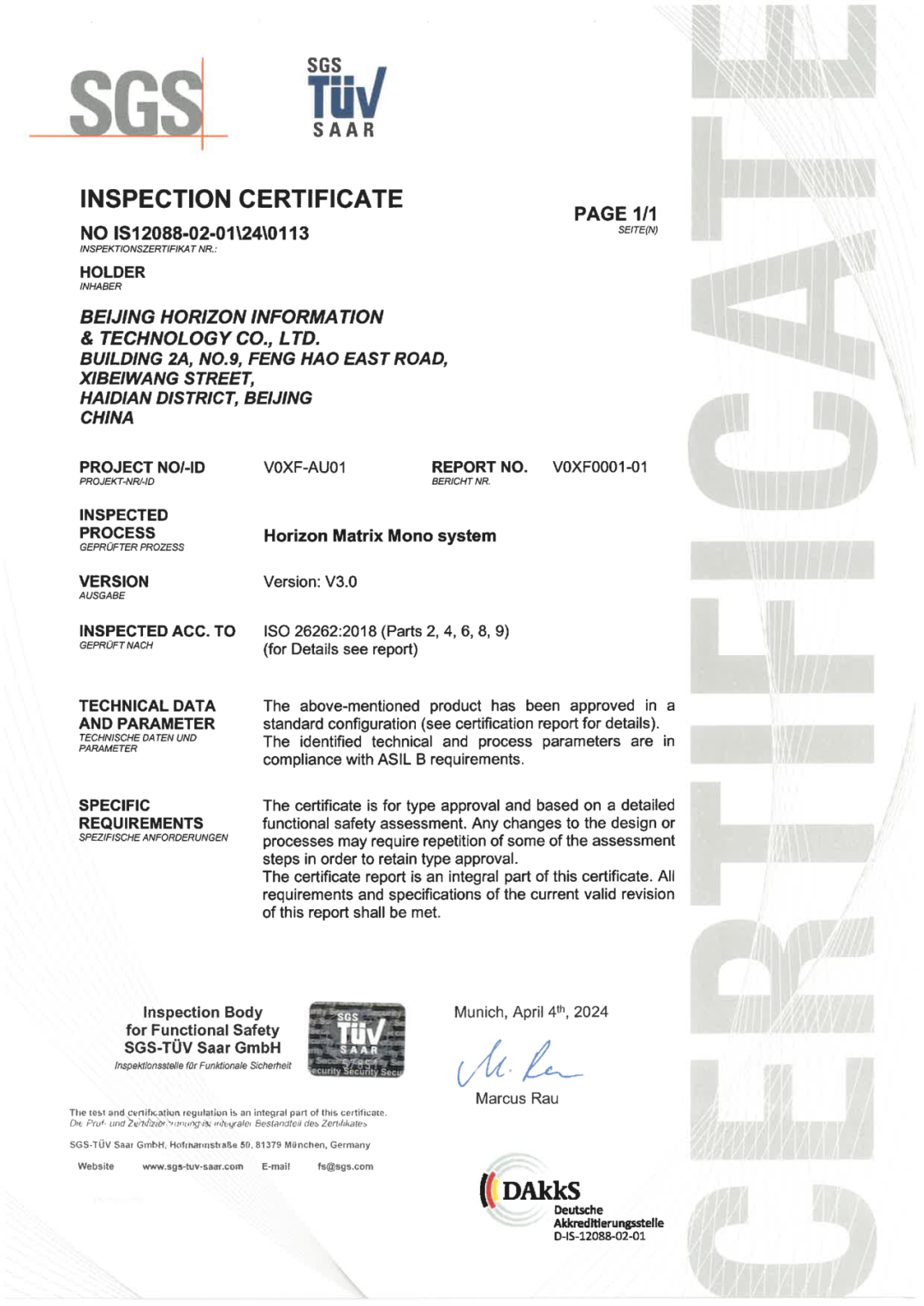 近日,地平线主动安全产品Horizon Matrix Mono (以下简称 Mono)获得国内首个ISO 26262功能安全ASIL B产品级功能安全认证。该证书由国际公认的测试、检验和认证机构SGS通标标准技术服务有限公司(以下简称“SGS”)颁发,这意味着地平线主动安全产品在产品层面获得了国际标准认可,为中国智能汽车“出海”提供更全面、更符合当地要求的安全助力。