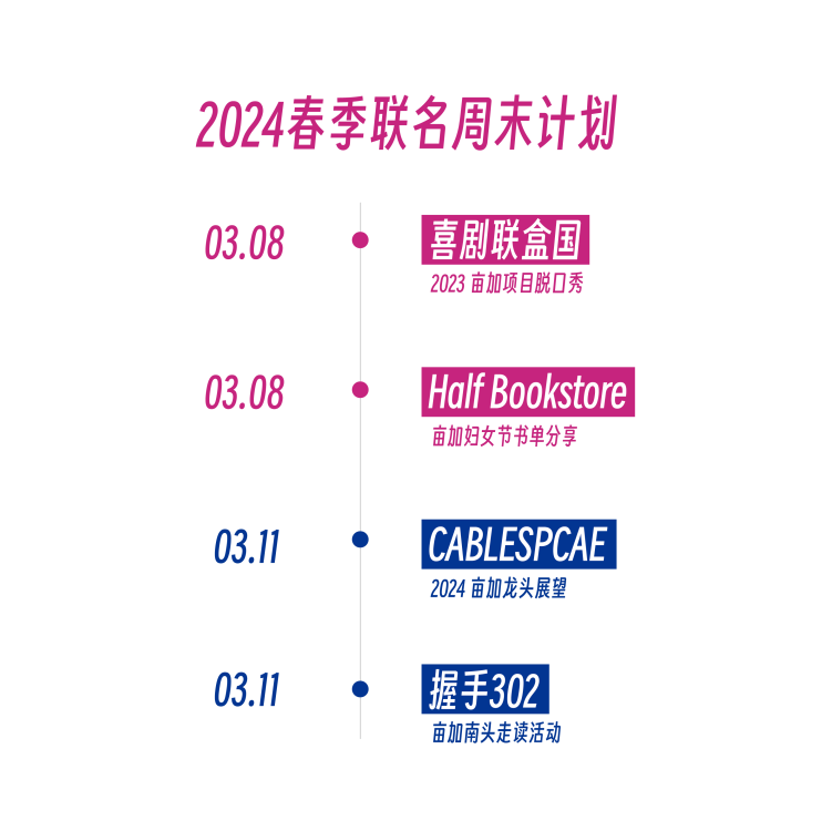 2024年3月8日和3月11日,亩加分别与四家我们熟悉或好奇的机构主体联名合作,度过了一个春意盎然的长周末。让我们时间回溯,回顾这两天里精彩瞬间。