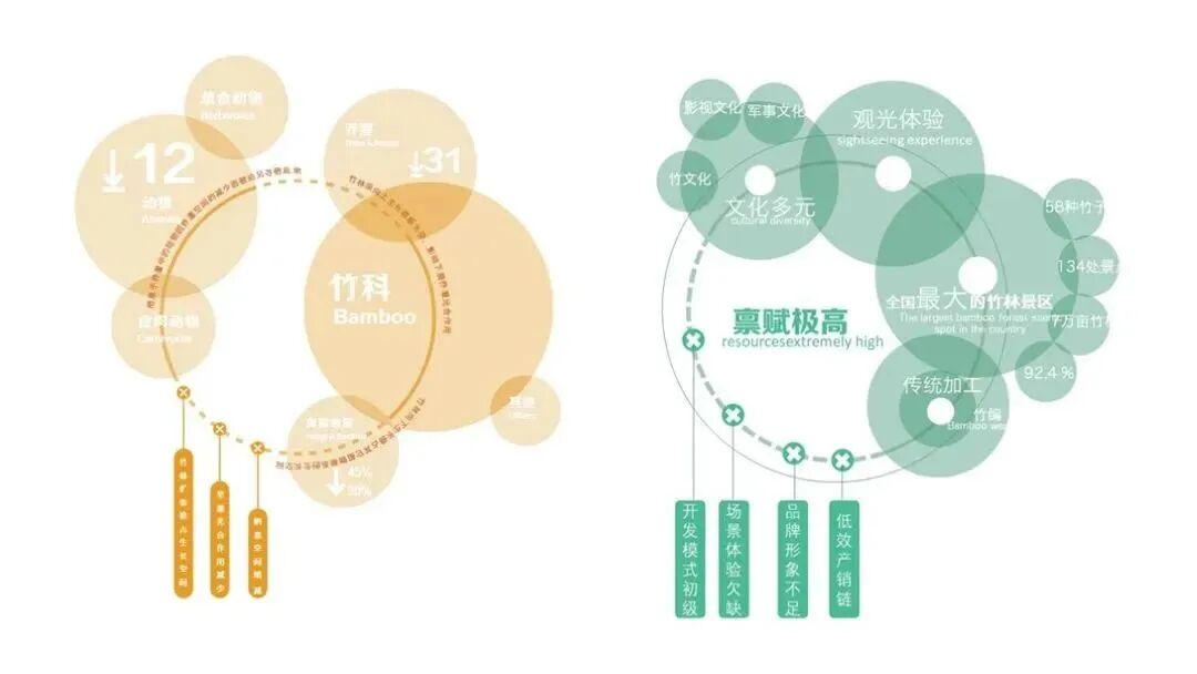 我们一直希望运用先进的规划设计理念寻找可持续文旅发展过程中低影响开发与经济成功的平衡点。于是我们从竹林生态系统及文旅生态系统的问题入手,提出丰富竹林林相和增强度假区产业引力等策略。
