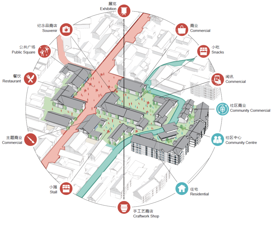 除了回归自然的开发逻辑,项目更聚焦实现乡村与旅游业共同发展、全资源联动的愿景,设计充分考虑旅游服务与当地居民的关系,提出“双面街”的空间模型。将居住社区落位在旅游主动线一侧,两个动线平行设置,让新增的商业及其他设施能同时惠及两类人群。两个动线中间的建筑群将扮演“双面街”的角色,在不同场景下发挥不同功能,体现规划设计的弹性。