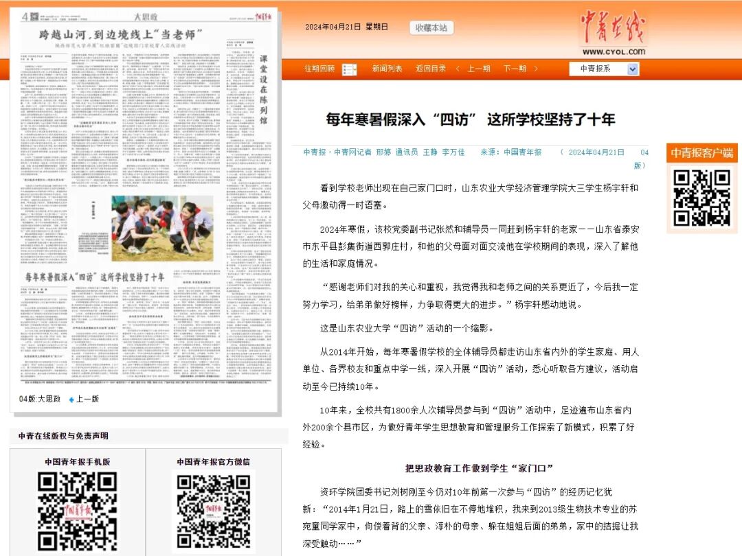 4月21日,《中国青年报》在04版刊发题为《每年寒暑假深入“四访” 这所学校坚持了十年》的文章,专题报道我校走访山东省内外的学生家庭、用人单位、各界校友和重点中学一线的活动开展情况。文章指出,10年来,山东农业大学共有1800余人次辅导员参与到“四访”活动中,足迹遍布山东省内外200余个县市区,为做好青年学生思想教育和管理服务工作探索了新模式,积累了好经验。