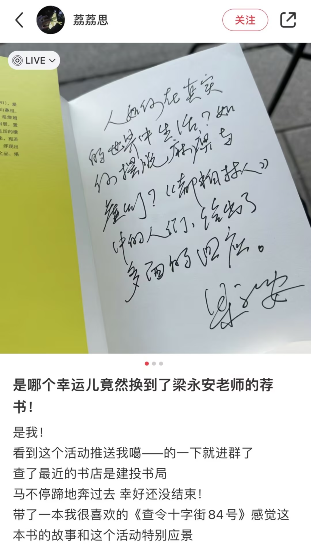 小红薯@荔荔思 抽到了梁永安老师送的《都柏林人》,发现扉页里还藏着梁老师写的寄语:“人如何在真实的世界生活?如何摆脱麻痹与虚幻?《都柏林人》中的人们,给出了多面的回应。”