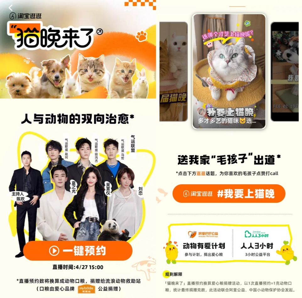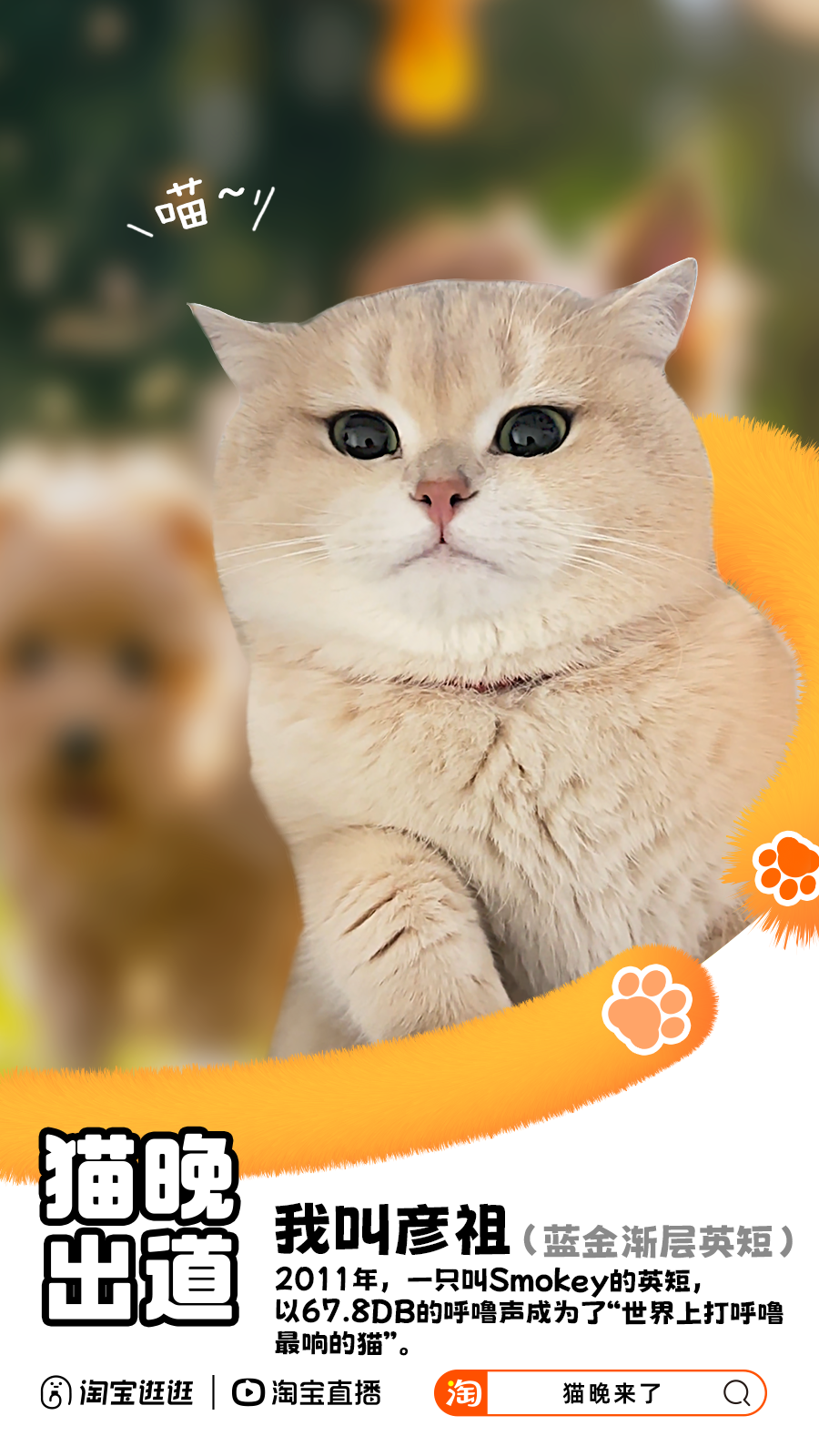 要我说,这世界上只有两种表情包流派:一种是猫猫狗狗派,一种是不承认自己是猫猫狗狗派的猫猫狗狗派。因为每个人手机里,至少都有一张和猫狗相关的表情包。猫猫狗狗表情包之所以普及率那么高,除了它们本身确实可爱,以及这两种动物是生活中最常见的宠物外。还有一个重要的原因:人们总能从猫狗身上看到自己的影子。哪怕是一些于猫狗而言,可能并没有什么情绪波动的动作、神态,也会被人类和自身的某种行为或情绪结合到一起,可悲可喜:如果遇到某些猫猫狗狗确实像人的情况,那就一定会成为朋友圈标配表情包:而下面这只叫彦祖的英短蓝金渐层,头像就是自己的表情包:不知道从什么时候起,把自家猫狗送去猫咖、狗咖打工,成为了主人吐槽宠物的一种流行句式。巧的是,前些日子四川成都有一只叫金勾钩的金渐层,在主人外出时,意外打开家中电磁炉导致房屋起火,造成10万人民币的经济损失:虽然这是一件非常具有警示意义的事,但通过这个案例,再结合猫猫狗狗表情包的普及率,以及网红猫狗日渐增多的现状。我们不难得出一个结论:猫猫狗狗确实有机会通过直播养活自己,甚至养活主人。更巧的是,早在这件事发生之前,淘宝逛逛就计划面向全网邀请猫猫狗狗入驻,通过更新日常+直播的形式,实现自己的口粮自己挣的野望。我们的原则是:拒绝动物表演,但顶不住动物非要表演。喜欢表演的动物朋友们有福了:由淘宝逛逛打造的明星萌宠秀《猫晚来了》,将于4月27日下午3点在淘宝直播。在这场主角含人量为0的“猫晚”,除了有前文提到的多比、彦祖、王圆来和小开(出道证中昵称为逛逛ID):![]()