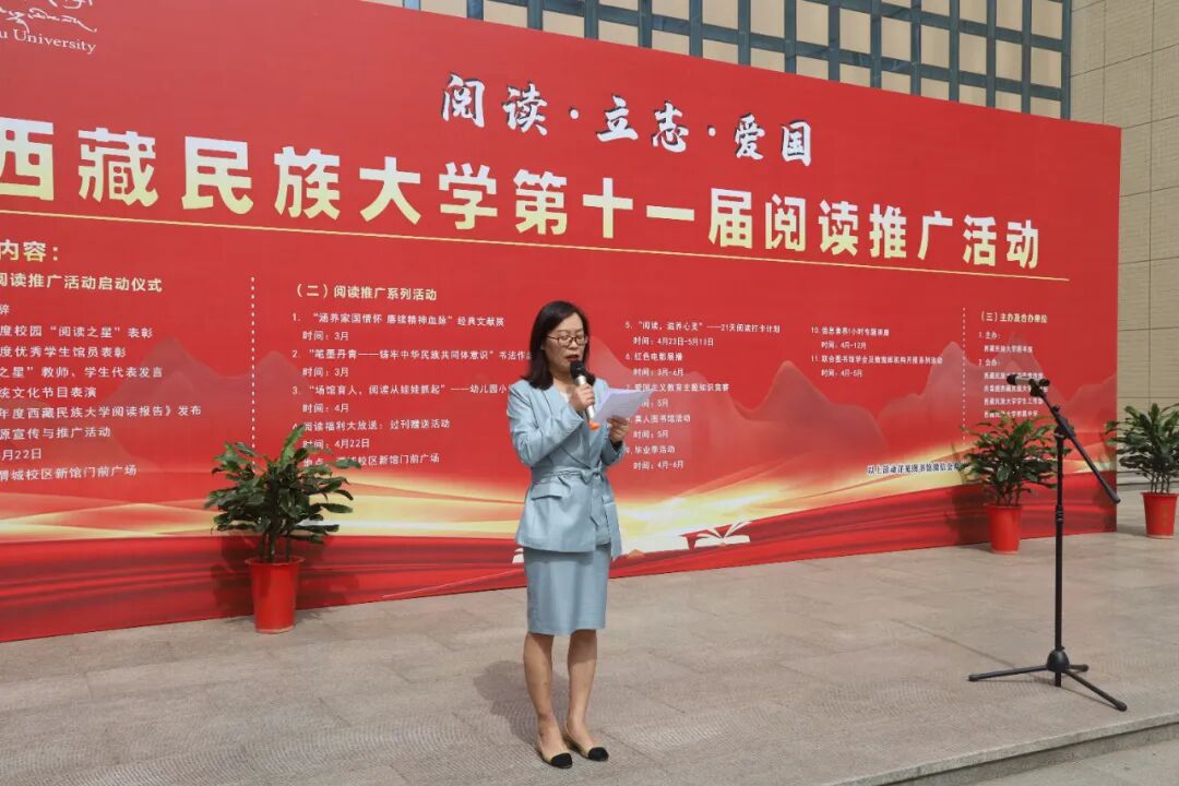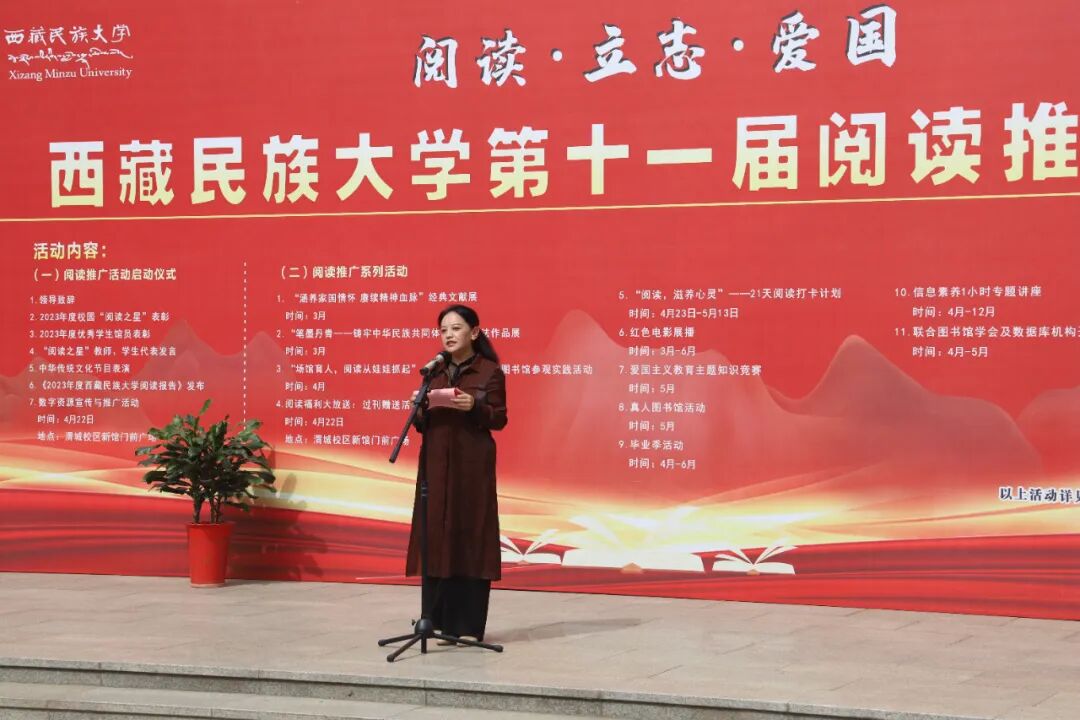 次旦玉珍在启动仪式上致辞。她指出:自古以来,中华民族就有崇尚读书、重视学习的优良传统,图书馆作为学校的重要文献信息中心,在营造书香校园文化、培育时代新人的过程中,扮演着至关重要的角色并具有无可比拟的优势。近年来,我校图书馆不断推进基础设施建设,丰富文献资源,优化阅读空间,提升数字化水平,加强特色馆藏的打造与服务的创新,全方位地为读者提供了更加舒适和高效的阅读体验,有效发挥了文化育人、服务育人、场馆育人的功能,取得了显著的成效和进步。希望通过形式多样、内容丰富、特色鲜明的系列活动的开展,进一步发挥图书馆在建设书香校园、弘扬中华优秀传统文化、促进民族团结中的积极作用。希望广大师生能以此次活动为契机,进一步贯彻落实习近平总书记致首届全民阅读大会的贺信精神,积极参与到阅读中来,与书为伍、与书为伴,形成“爱读书、读好书、善读书”的浓厚校园阅读氛围。