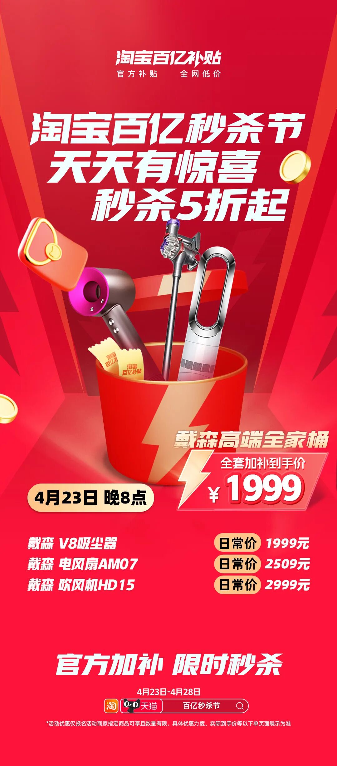 摘要:淘宝百亿秒杀节,今晚8点开抢!划重点8888元秒苹果系列全家桶!1999元抢戴森全家桶!299元冲欧舒丹洗护