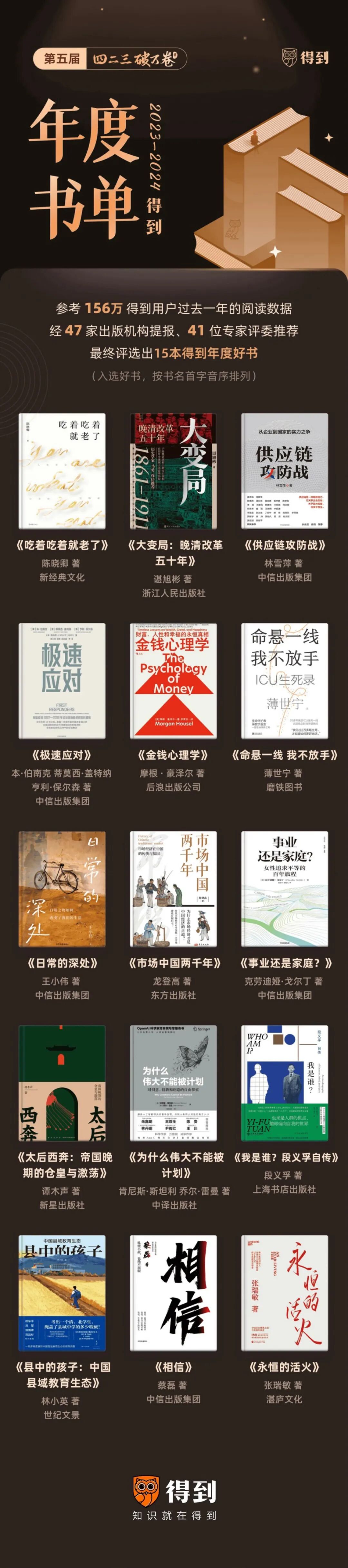 今年的书单,经由47家出版机构提报,41位专家学者推荐,并参考了156万得到电子书会员过去一年的阅读数据,多轮评审后才最终决出。
