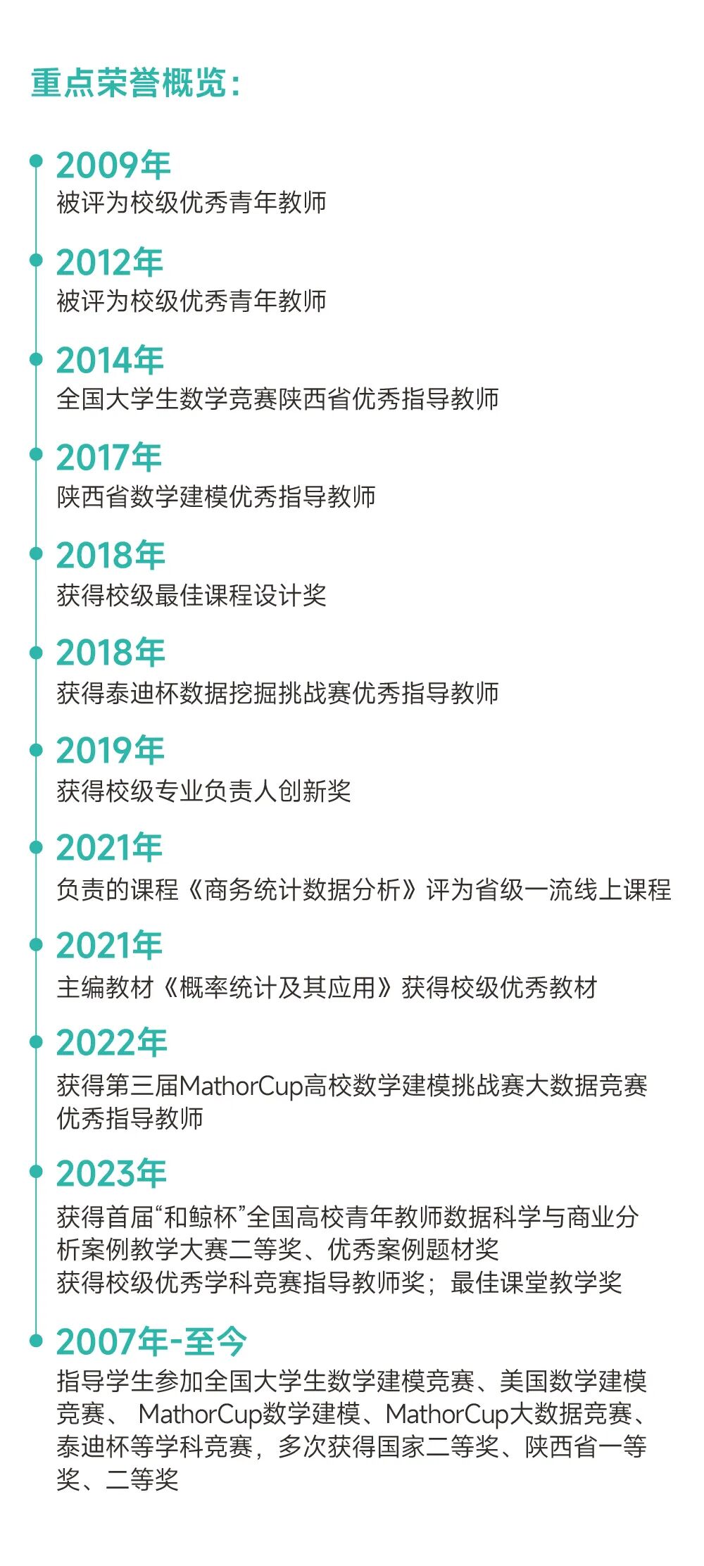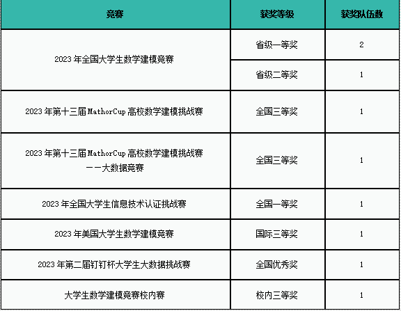 “大数据专业的学生们对于参与各种竞赛都十分感兴趣,经常有学生在竞赛前的深夜还在与我探讨模型。深夜线上修改、周末线下探讨于我和学生们而言都是家常便饭。”2023年张俊丽组织、指导学生参加各类学科竞赛,校级以上获奖9项25人次。![]()
