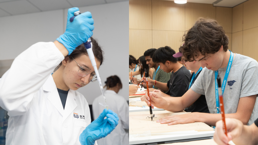 去年夏天的西湖大学云谷校区,迎来了首届西湖高中生暑期学校的同学们。来自中国、美国、英国、土耳其、韩国、英国的41名学员分成三组,每天上午雷打不动地进入生物实验室、化学实验室、工科实验室开展科研实训,下午则丰富自由一些,体验西湖校园、体验中国文化,也体验杭州这座创新与历史并存的城市。