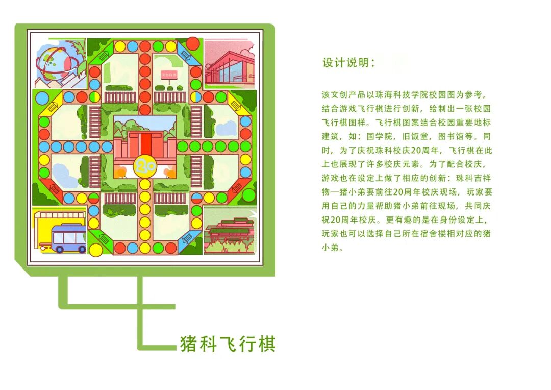 该文创产品以珠海科技学院校园图为参考,结合游戏飞行棋进行创新,绘制出一张校园飞行棋图样。飞行棋图案结合校园重要地标建筑,如:国学院,旧饭堂,图书馆等。同时,为了庆祝珠科校庆20周年,飞行棋在此上也展现了许多校庆元素。为了配合校庆,游戏也在设定上做了相应的创新:珠科吉祥物—猪小弟要前往20周年校庆现场,玩家要用自己的力量帮助猪小弟前往现场,共同庆祝20周年校庆。更有趣的是在身份设定上,玩家也可以选择自己所在宿舍楼相对应的猪小弟。