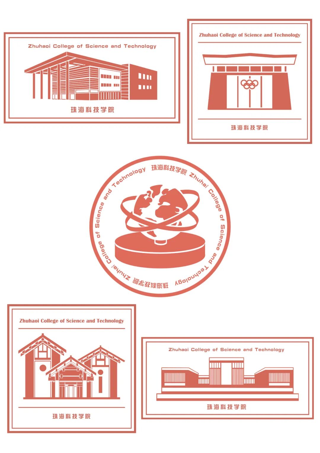 建筑分别为:古亭,图书馆,五环体育馆,地球仪这四个校园标志性建筑。此次校园文创设计充分迎合了现代年轻人审美,采用插画的风格来表现珠海科技学院标志性建筑的特点,创作出“我与珠科的四季”为灵感,庆祝校园20周年。也让观赏者欣赏到校园风景的魅力。