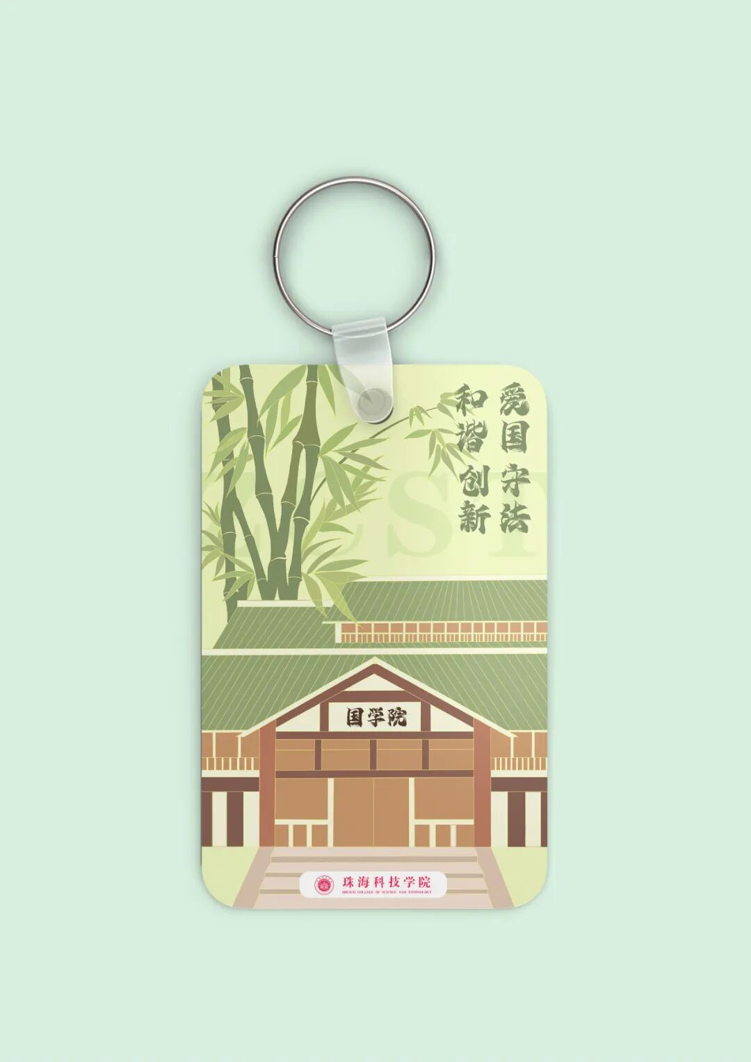竹子—卡套以绿色为主色调,主建筑物是珠海科技学院国学院,搭配浅绿色的竹叶纹饰。