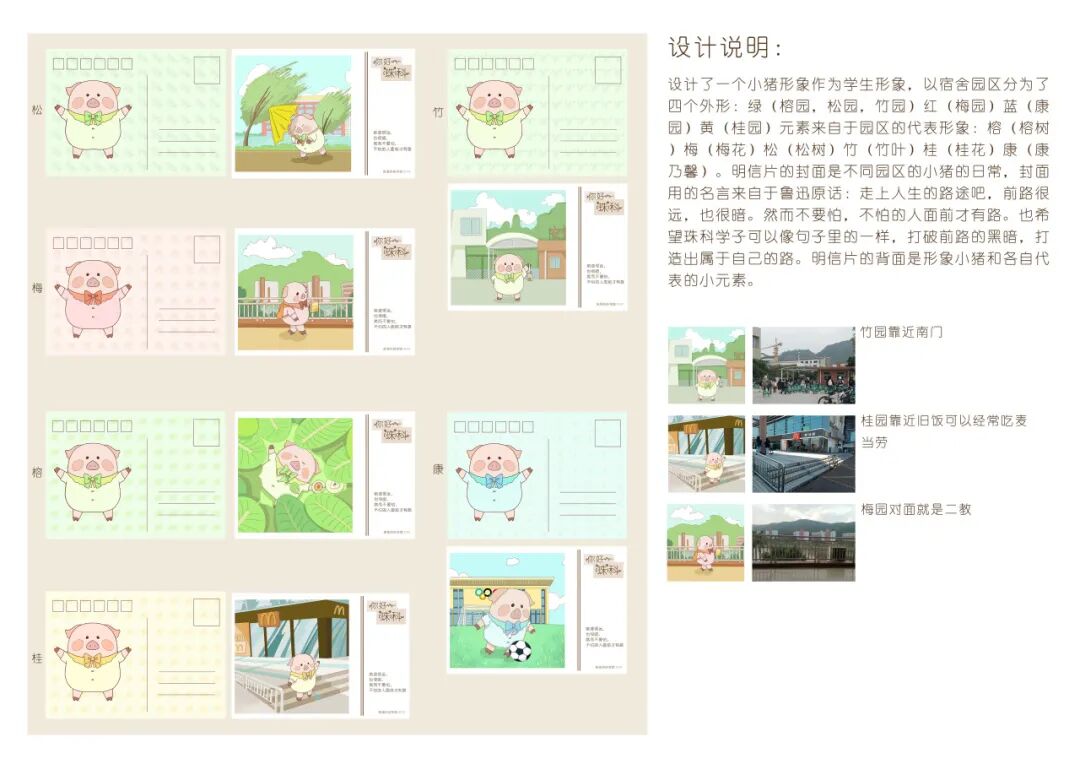 设计了一个小猪形象作为学生形象,以宿舍园区分为了四个外形:绿(榕园、松园、竹园),红(梅园),蓝(康园),黄(桂园)元素来自于园区的代表形象:榕(榕树)、梅(梅花)、松(松树)、竹(竹叶)、桂(桂花)、康(康乃馨)。明信片的封面是不同园区的小猪的日常,封面用的名言来自于鲁迅原话:走上人生的路途吧,前路很远,也很暗。然而不要怕,不怕的人面前才有路。也希望珠科学子可以像句子里的一样,打破前路的黑暗,打造出属于自己的路。明信片的背面是形象小猪和各自代表的小元素。