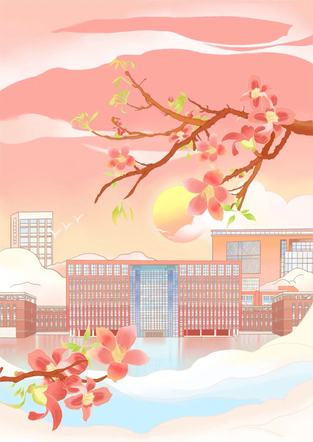 画面中心,一座座古朴典雅的教学楼错落有致,以沉稳的蓝色为基调,彰显出学院深厚的文化底蕴。楼宇间,粉色的桃花树随风摇曳,花瓣飘落,宛如粉色的梦境,为庄重的学院增添了一抹浪漫与温柔。夕阳的余晖洒落在学院的每一个角落,为整个画面增添了一抹温馨与宁静。