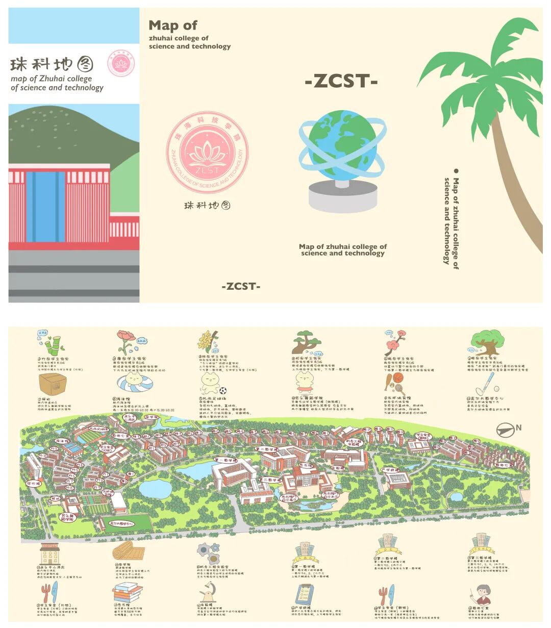 本次文创设计围绕珠海科技学院校园建筑作为主题,提取珠科建筑的主要颜色进行配色。意在展示珠海科技学院的风采风貌,并对珠科起到宣传效果。作品中主要绘制了图书馆、地球仪、五环体育馆、永乐半山等主要建筑物,制作了珠科地图、建筑物印章、卡套、邮票、纸袋等文创产品。地图以手绘风格进行设计,绘制出珠科校园全景图并对校园各个地点加以说明,绘声绘色的为大家讲述珠科全貌。建筑物印章选取校园几处较为代表性建筑进行绘制具有纪念意义。卡套、邮票、纸袋等文创产品具有实用性,能够为我们的日常生活所用。文创产品整体以珠科代表色进行设计呈暖色调,不仅传达出一种蒸蒸日上、充满朝气的校园风貌,也是对即将到来的20周年校庆的赞美,祝愿珠海科技学院新的一岁更上一层楼。