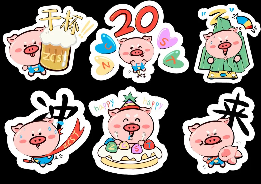 以猪的形象对珠科吉祥物进行创作,保留原有吉祥物“蛋”的形状,相识的颜色,增加蛋糕,蜡烛,彩带等代表20周年校庆的元素,即不丢失原有的吉祥物特色,又有了新的形象,创作更加符合珠科20周年校庆的IP。作品以创作的吉祥物进行衍生品贴纸、徽章、手机壳和拼图设计,丰富吉祥物的形象,给人一种可爱,欢乐庆生的感觉。