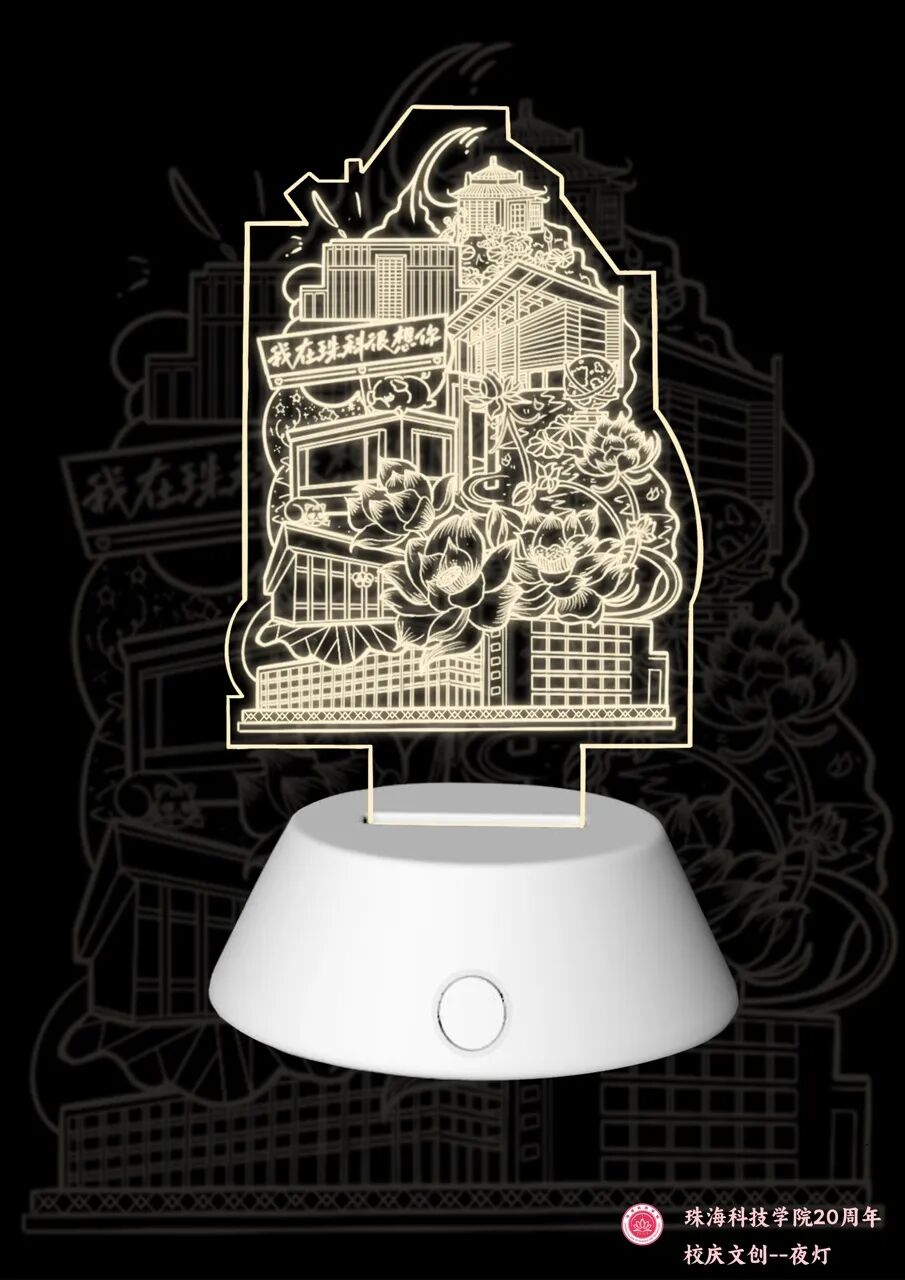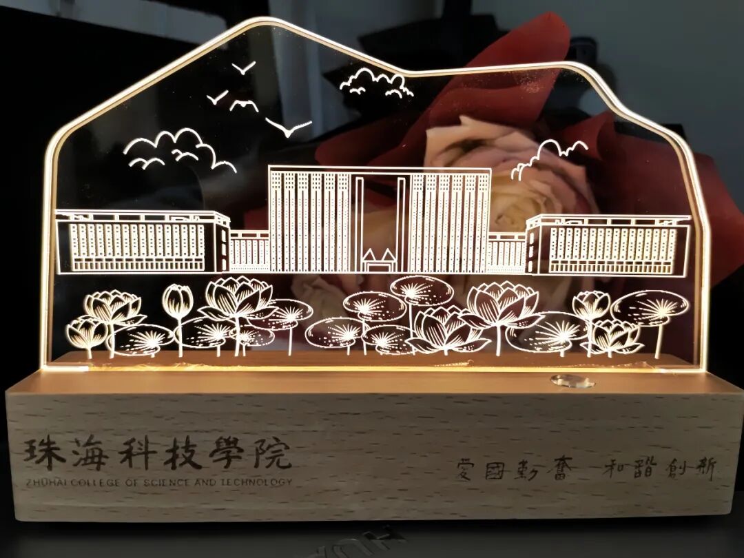 作品的底座采用木制,将灯管藏于上部亚克力板与底座的交接处,采用触摸式感应开关,实用美观。并且底部雕刻珠海科技学院的校名和校训“爱国勤奋,和谐创新”,增强对于珠科母校的归属感,将校训铭记于心,恪守校训。