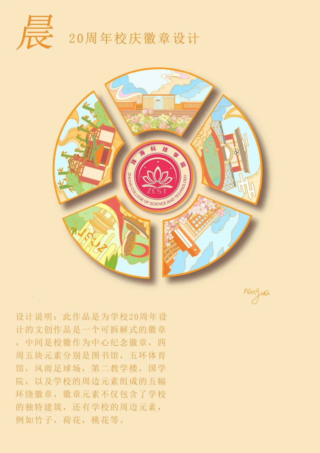 该设计采用了校内具有的特色作为画面的主要元素——五环体育馆、图书馆、大巴校车、猪脚饭、青桔单车、以及校园里特有的花:夹竹桃、洋紫荆、荷花、蟛蜞菊。学校建校二十周年,犹如一个伟大的母亲保护着学子们,盼望着大家茁壮成长,但也只有桃李年华的珠科,我使用了靓丽的粉色和青春的绿色为画面的主色调,希望学校永远如少女一般。在大巴车牌上写上了2004,这是建校年份。祝愿以后的发展就像大巴车一样,不断前进,驶向成功,到达下一站。
