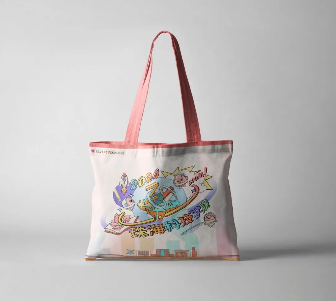 此次系列设计同时加入了“珠科星系”的概念,文创布包的设计中,漂浮起来的珠科吉祥物们发现了“新大陆”,而这正是“珠科星系”的中心——Z型图标所处的浮空岛,象征着珠科对于珠科er们的核心地位。在设计图的底部区域加入了珠科的著名地标,为设计增加典型性。整体的配色上运用了偏向明快的糖果色系,旨在描绘五彩斑斓的珠科世界。而在T恤的设计里,以Z型图标为基准环绕成的珠科星,则代表知识的浩瀚需每一位珠科er勉力探索。设计上与布包相反,采用了简练的线条构成图形,增加其独特的质感。