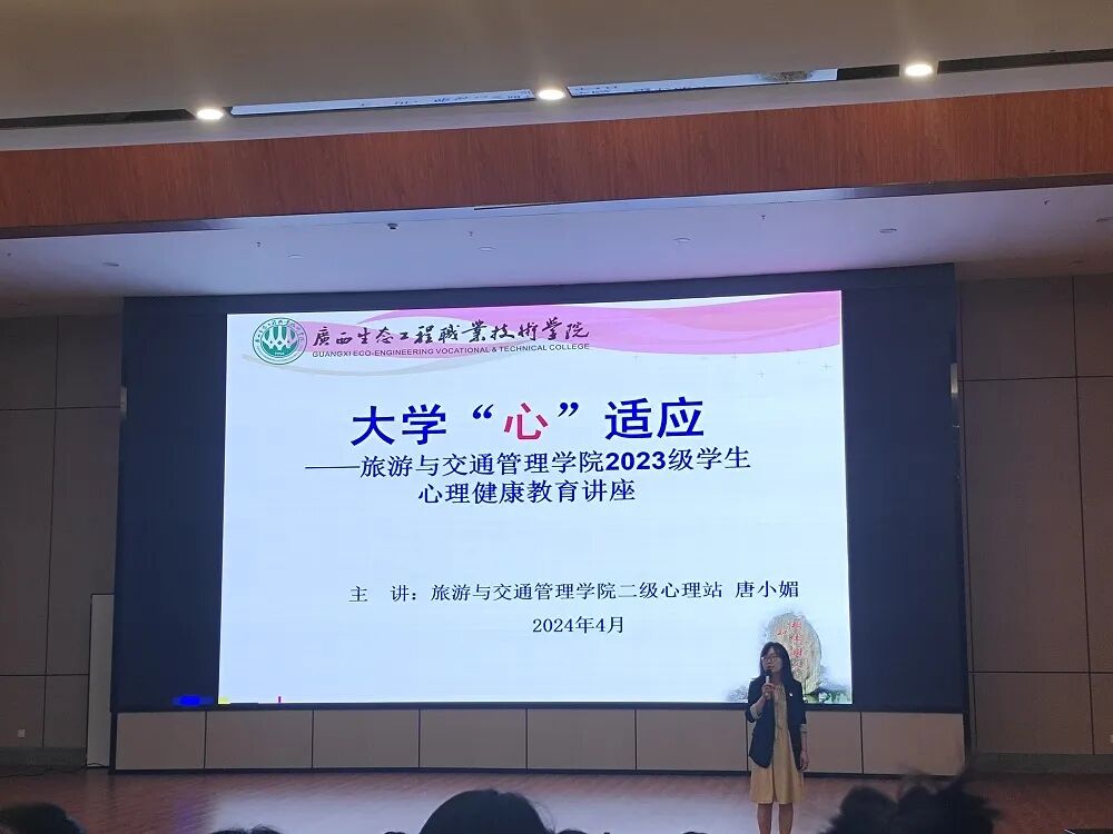 4月17日,旅游学院在图书馆知行报告厅开展了以“大学‘心’适应”为主题的心理健康教育讲座。讲座由二级心理工作站唐小媚老师主讲,学院全体2023级学生参加讲座。