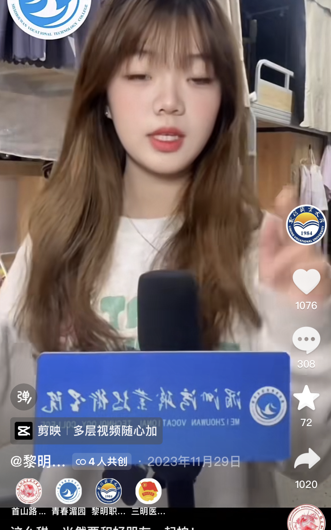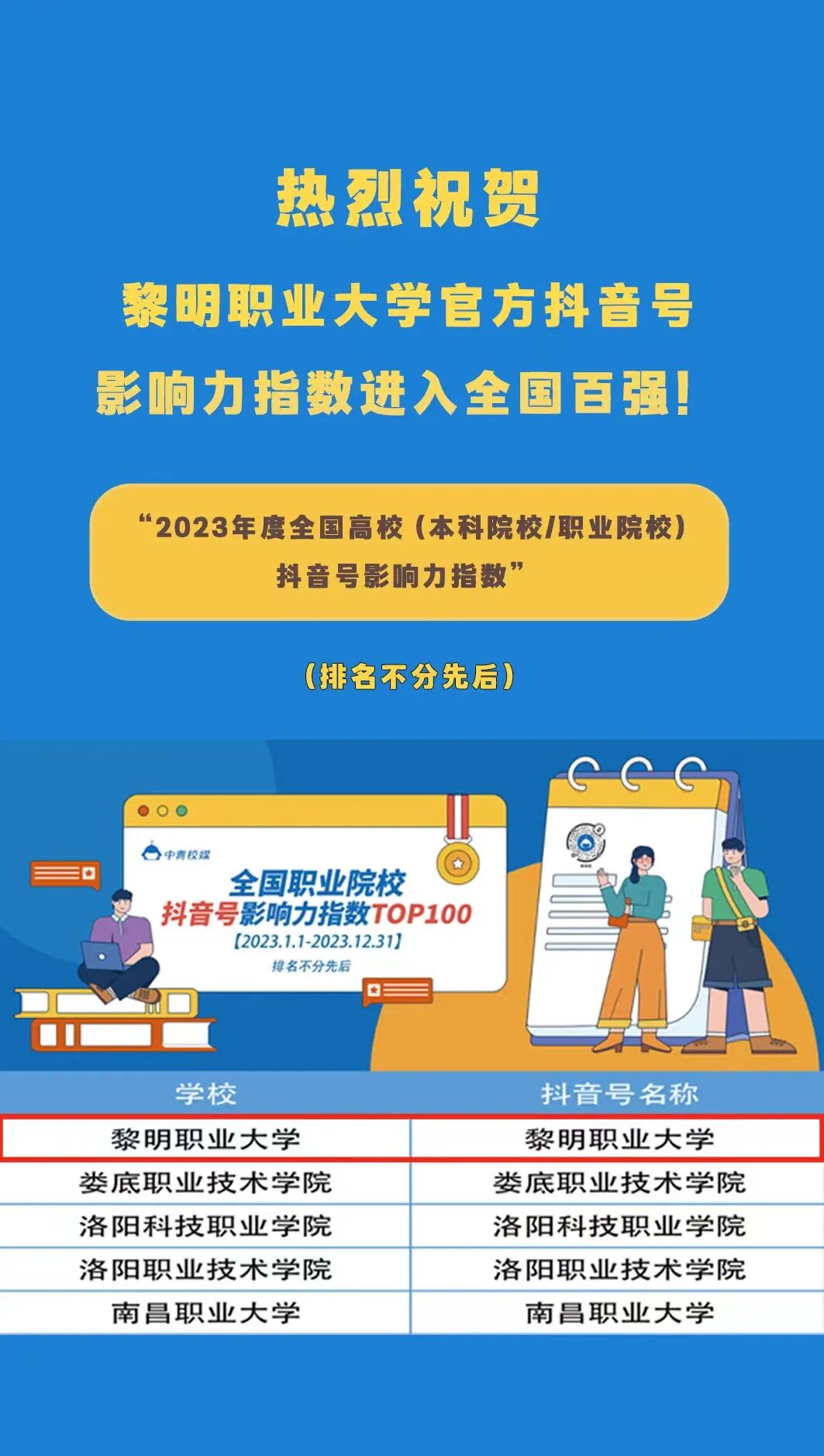 ▲记者站运营的黎明职业大学官方抖音在2023年入围中国青年报“2023年度全国高校抖音号影响力指数百强”