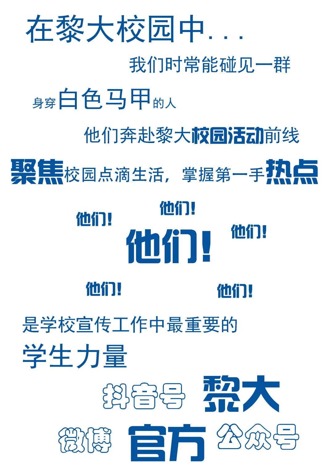 这里是隶属于校党委宣传部的全媒体学生记者站,我们是一支功能齐全,积极向上的强大队伍,是学校宣传工作中重要的学生宣传力量。近年来,全媒体学生记者站不断创新工作机制,在讲述黎大好故事、传播黎大好声音、弘扬黎明精神方面做了大量有益探索,致力于提升学校的影响力、知名度和美誉度。