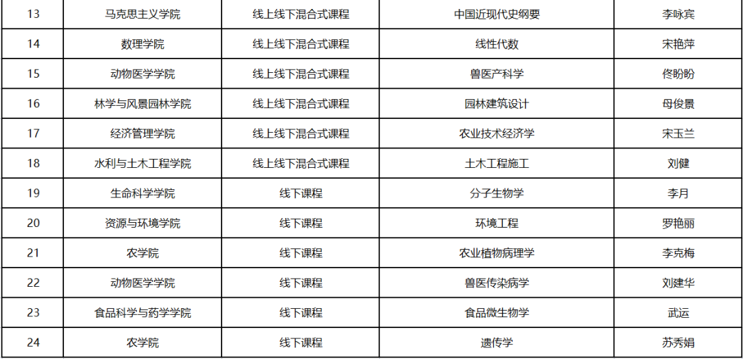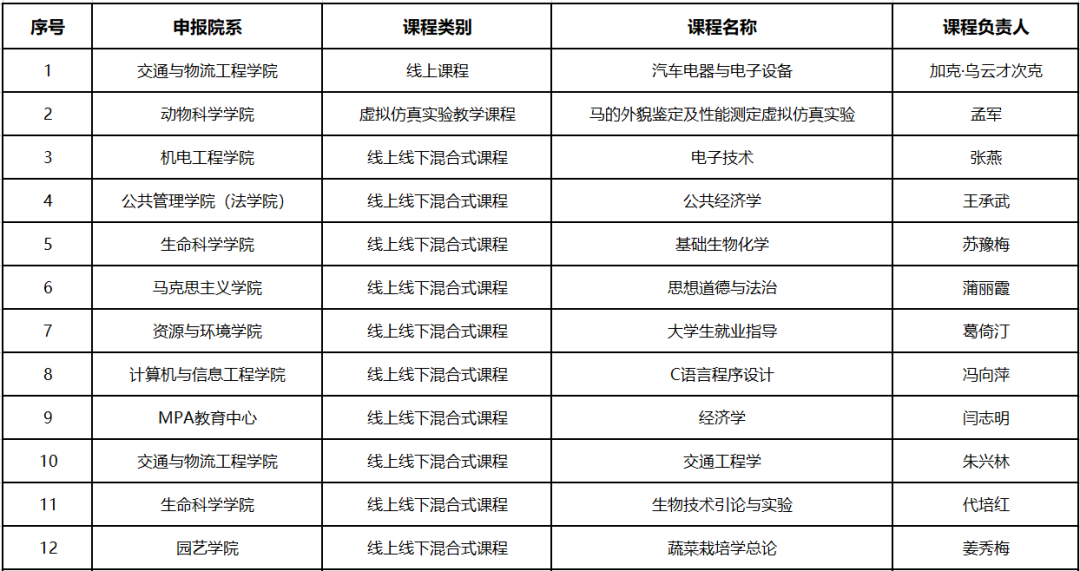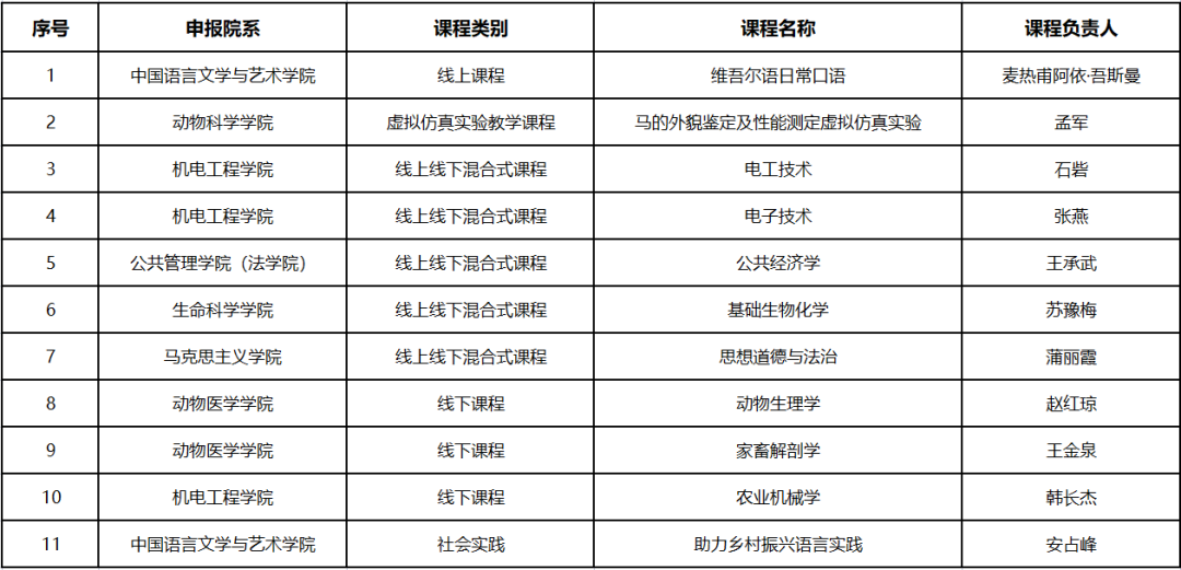 近日,自治区教育厅公布了第三批自治区级一流本科课程认定名单、国家级一流本科课程拟推荐名单,新疆农业大学24门课程获批自治区级一流本科课程,其中:线上一流课程1门,虚拟仿真实验教学课程1门,线下一流课程6门,线上线下混合式一流课程16门;11门课程被推荐参评国家级一流本科课程。