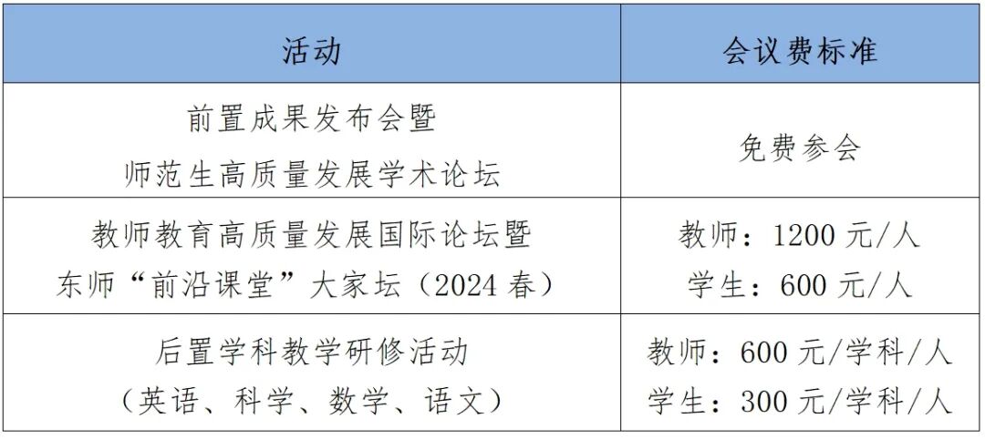 东北师范大学全体师生全程免费参会,每所田家炳学校每个活动有20个免费参会名额。以上两类人员需在报名时提供相应身份证明,具体要求见报名链接。其他人员会议费收费标准如下。