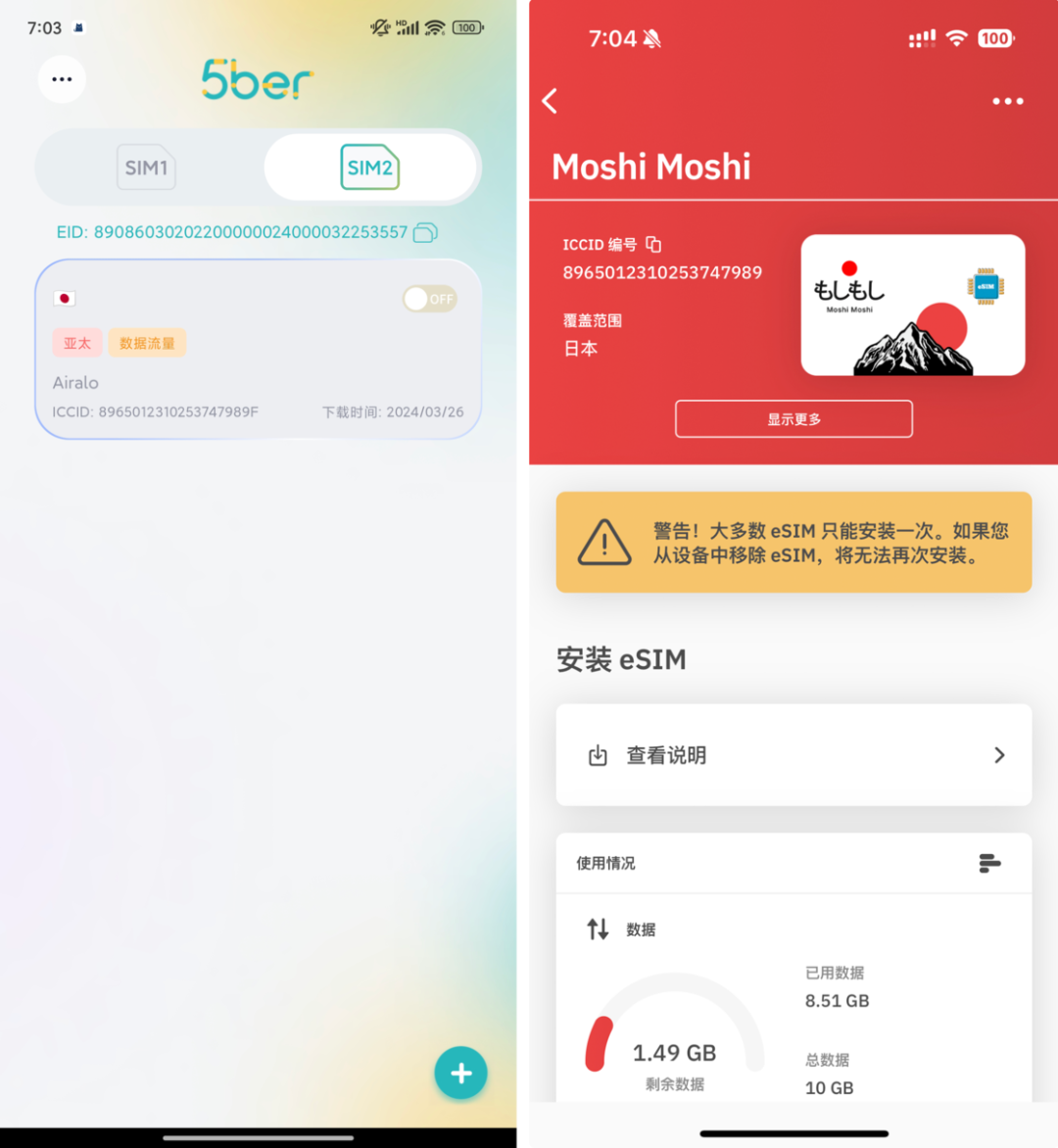 由于最近 5ber 的推广内容挺多,我先来叠个甲,我这张 5ber 为完全自费购买,自己使用,请放心食用。没有什么比在海外保持通讯连接更重要的了,随着出国次数的增多,我在淘宝上买过不少周期性即用即抛的电话卡,新西兰、新加坡、韩国、泰国、日本……很多时候只是转机经过,并不会长久停留,换卡麻烦不说,一次五六十的均价,每次用完就扔,也让我觉得有点心疼,我觉得是时候找一个可重复利用的方案了。恰好这次休年假前往日本,我提前购买了 5ber 实体 eSIM 卡,来看看能否让没有 eSIM 的国行设备实现「曲线救国」。5ber 的这张卡是一张可以写入 eSIM 运营商的空白 SIM,你只需要在线购入需要的运营商套餐,通过 5ber Android 版扫码写卡,就可以正常使用。对于我个人而言,最为看中的是:在 Android 上写入开通后,就可以拔下 5ber 这张实体 SIM,插到任意设备上正常使用,这也包括 iPhone。拿我这次的日本出行举例,我购买了 eSIM 提供商 Airalo 的日本套餐,先使用 Android 写卡,起飞前在 5ber 应用上勾一下 ON 打开使用,到了目的地直接插上 iPhone 就能用了,通过 iOS 上的 Airalo 应用还可以查看剩余数据流量、套餐到期时间等相关信息,体验非常丝滑。如果你主力用的是 Android 手机,则会更为方便,省去了拔卡的步骤即可直接使用,可以实现近似于原生 eSIM 的体验,使用 5ber 应用在多个运营商之间来回切换也变得十分方便。当然,如果像我一样主要使用 iPhone,意味着你必须要一台支持 5ber 的 Android 设备搭配使用,你可以前往官网支持设备的列表查看,更为简单的办法是下载 5ber 应用,会直接标明当前设备的兼容情况。拥有 eSIM 的便利之处就是人在家中,就能在线接入更多国家地区的运营商网络,官方提供了 Standard(2 次免费 eSIM 下载)和 Premium(无限 eSIM 下载)两种规格,如果想要长久使用还是建议选择 Premium,第三方电商平台购买也要比官网标注的 25 美元便宜。⌚️