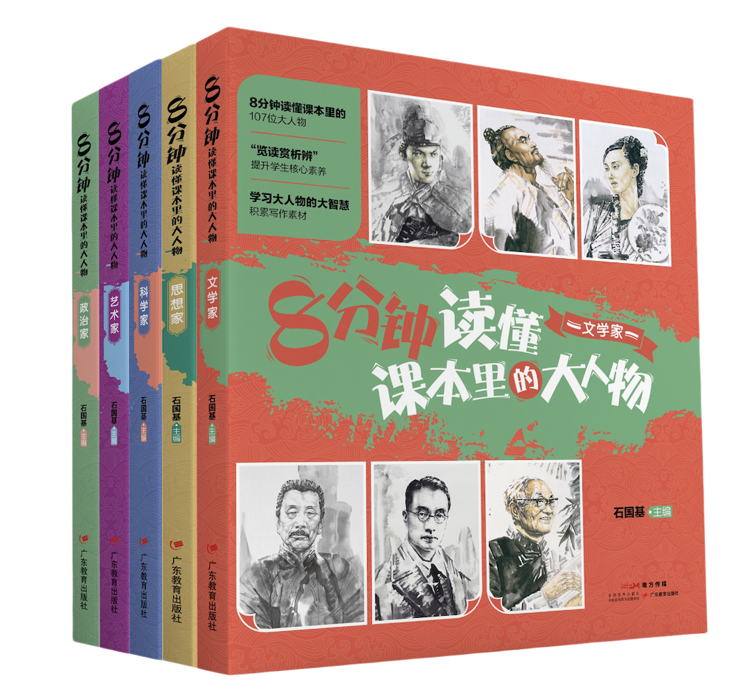 《8 分钟读懂课本里的大人物》收录的皆是中小学课本中的重要名人,划分为“政治家”“思想家”“科学家”“艺术家”“文学家”五册。