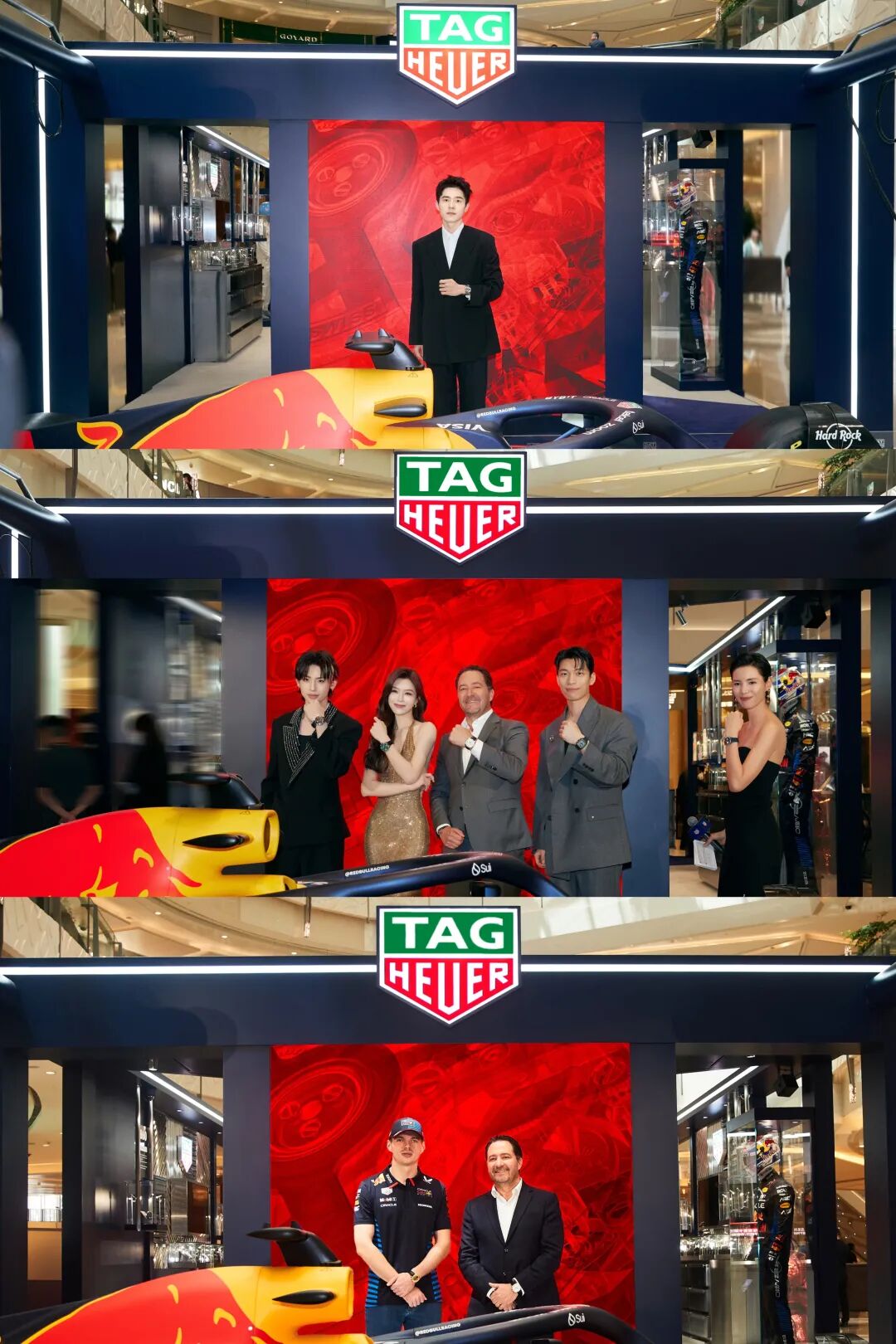 泰格豪雅首席执行官Julien Tornare、红牛车队车手维斯塔潘、品牌大使刘昊然和魏化俊、歌手兼音乐制作人小鬼、导演辛爽和演员文咏珊先后参观限时店