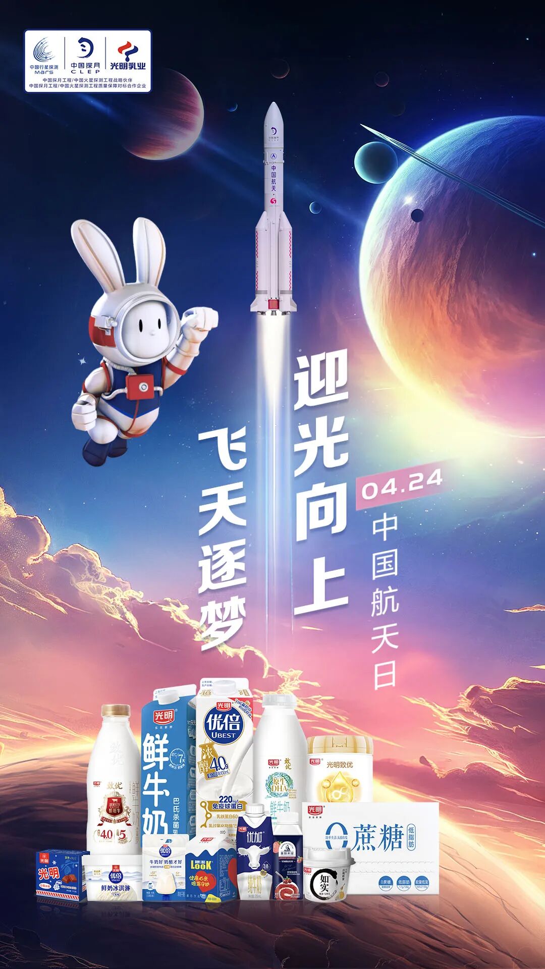 今天,我们迎来了主题为“极目楚天,共襄星汉”的第九个中国航天日。光明乳业作为中国探月工程官方战略合作伙伴,多年来一如既往地支持与助力中国航天事业的发展,见证我国航天事业的每一个光明时刻。