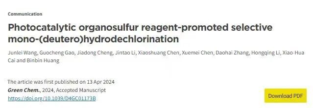 近日,我校化学工程学院青年教师王俊雷在有机光催化合成化学领域取得重要进展,研究成果以“Photocatalytic organosulfur reagent-promoted selective mono-(deutero) hydrodechlorination”《可见光催化有机硫试剂促进的选择性去氯氢/氘化反应》为题发表在国际著名期刊《Green Chem.》(绿色化学)(SCI, IF=9.8, 中科院1区Top)上。贵州民族大学为第一单位,王俊雷为第一作者,李洪庆教授为通讯作者,北京师范大学(珠海)黄彬斌老师为合作通讯作者。《Green Chemistry》(绿色化学)是一本以化学综合研究为特色的国际期刊。该刊由Royal Soc Chemistry出版商创刊于1999年,该刊已被国际重要权威数据库SCI、SCIE收录。偕二氯甲基基团广泛存在于抗生素、抗癌等药物分子结构中,同时,在合成化学领域,二氯甲基也是合成化学中重要的合成子。本研究报道了一种可见光催化有机硫试剂促进的选择性去氯氢/氘化反应,成功地构建了二氯甲基和氘代二氯甲基片段。机理探索表明,环己硫醇和底物分子形成的EDA复合物是该反应进行的关键因素。克级反应和天然产物及药物分子后期官能团化反应表明该方法具有潜在的应用价值。该项研究得到了贵州省科技项目(No.ZK[2021]YB042, ZK[2022]193),贵州省教育厅青年人才成长项目(ky[2022]189),贵州民族大学科技项目(GZMUZK[2022]YB10),贵州省科技计划项目(黔科合平台人才-GCC[2023]035、CXTD[2023]003),贵州省高等教育机构创新团队项目(No.[2022]13)的资助。