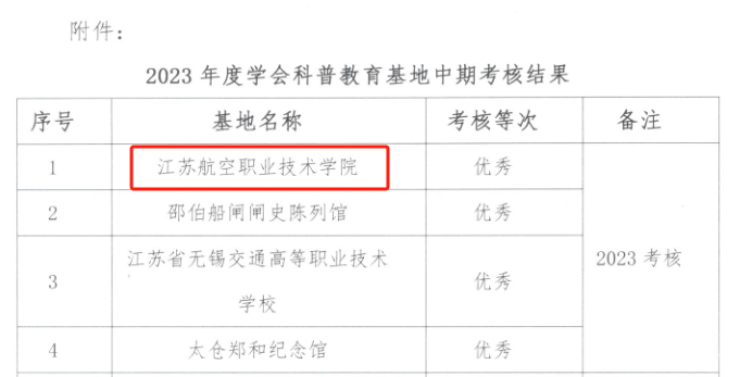 近日,江苏省综合交通运输学会公布了2023年度学会科普教育基地中期考核结果。经总结材料申报、专家评审、现场核查,在2019年认定的14家首批学会科普教育基地中,江苏航空职业技术学院民航科普教育基地获评优秀等次。根据《江苏省综合交通学会交通科普教育基地认定与管理办法》精神,本次考核结果为“优秀”的,在认定期满后自动续评为省综合交通运输学会科普教育基地。