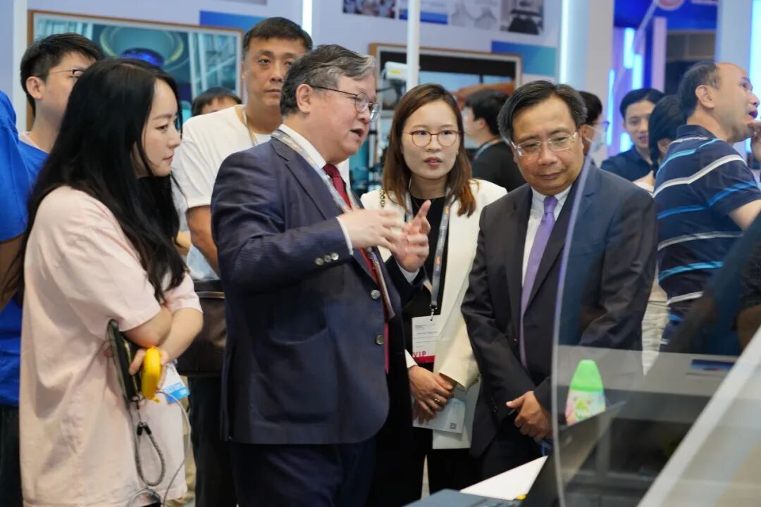郭教授(前排左二)为莅临摊位参观的香港特区政府创新科技署署长李国彬先生(前排右一)以及助理署长(创新平台) 陈楚颖女士(前排右二),简介HKGAI的各项研究项目和成果。