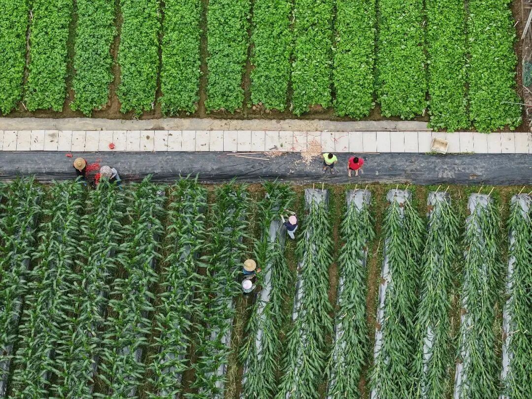 4月18日,广西南宁,农民在蔬菜基地护理倒伏的玉米秆。