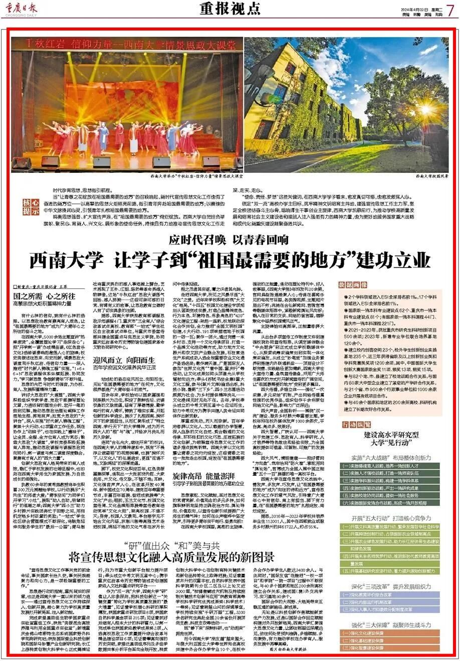 讲好大思政的“大道理”,西南大学积极组织专家学者、党政干部撰写理论文章,力透纸背的理性分析、宕开一笔的独到见解,推动思想政治理论阐释工作落地生根、掷地有声;拉宽大思政的“大讲台”,深入实施“时代新人铸魂工程”,聚焦十大行动、42项重点工作任务,既在协作上“动脑子”,也在实践上“撸袖子”,让全员、全程、全方位育人成为常态;锻造大思政“大课堂”,学校党委积极拓展育人阵地,推动思政课程与课程思政同向同行、第一课堂与第二课堂深度融合,聚集育才育人的“西大力量”。