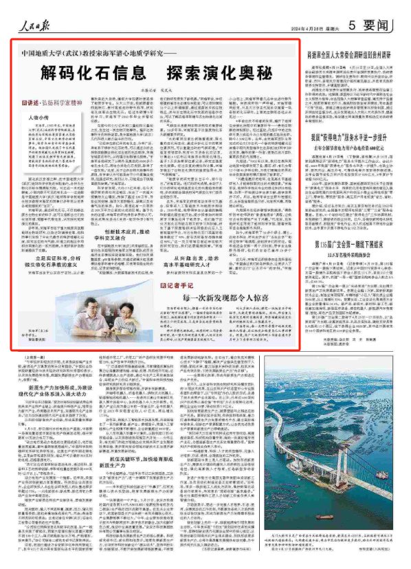 4月20日,《人民日报》以《中国地质大学(武汉)教授宋海军潜心地质学研究——解码化石信息 探索演化奥秘》为题报道宋海军教授潜心科研故事。他专注重大地质突变期地球生物学研究,探究古生物与气候、环境之间相互作用和协同演化的一系列规律,为更好保护自然环境提供支撑。