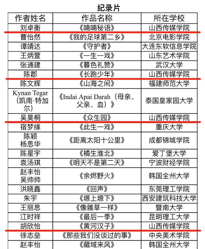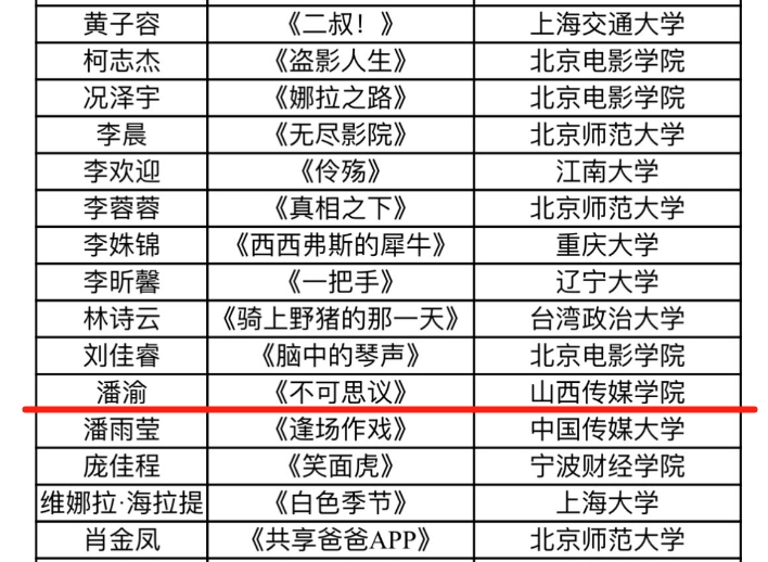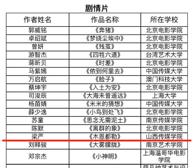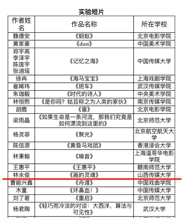 近日,北京国际电影节第31届大学生电影节入选名单公布,我校多部学生作品入围。在国际大学生原创影片推选单元中,视听学院2019级影视摄影与制作专业梁严等同学的《木恩都勒》入选剧情片类别;视听学院2020级广播电视编导专业刘卓衡等同学的《喃喃秘语》、2020级广播电视编导专业陈郡等同学的《长跑少年》、2021级广播电视编导专业胡欣怡等同学的《黄河汉子》、2021级广播电视编导专业吴昊桐等同学的《众生园》入选纪录片类别;山西电影学院2019级戏剧影视文学2班林永俊作品《画的灵魂》入选实验短片类别。在青年优秀剧本推选单元中,山西电影学院2020级戏剧影视文学2班潘渝作品《不可思议》入选。其中《画的灵魂》曾获山西传媒学院山西电影学院首届“小山奖”最佳剧本奖、第七届平遥国际电影展“平遥一角”展映活动选送作品。
