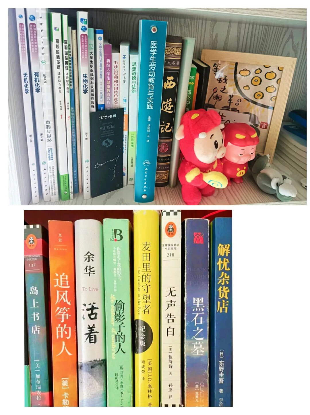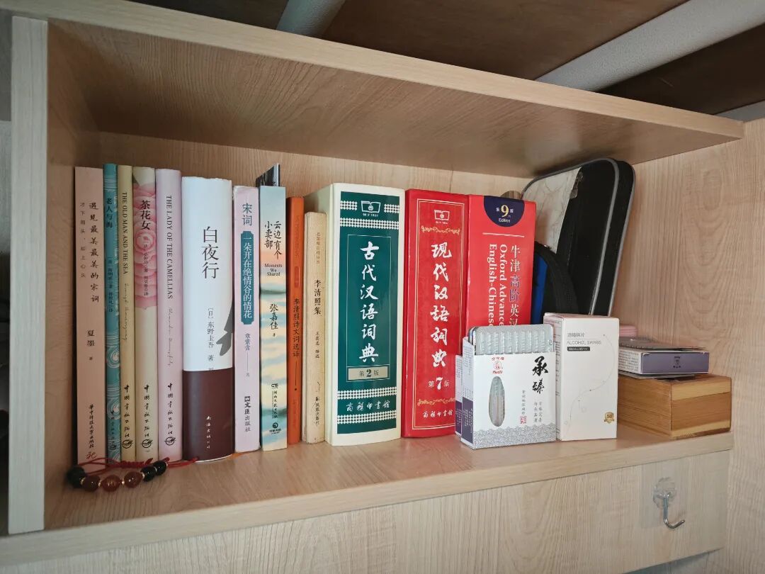 我的书架主要分为两部分,一部分就是平常上课所需的教材。作为一名医学生,“书不离手”是最基本的要求。 一部分则是我的课外书籍,我平常比较喜欢看一些文学类小说,久而久之,发现我的课外书籍好像都是文学小说类的。在周末的空闲时间,我会拿出我的课外书籍,安静的坐在桌子前看上一会,这个时候整个人都是放松的。