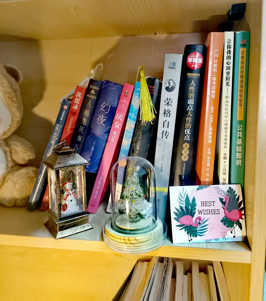 在我的书架上,更多的是张嘉佳的作品,其中我最喜欢的是他的著作中的《云边有个小卖部》,是一本关于亲情、友情和爱情的小说,它通过主人公刘十三的成长经历,讲述了他在生活中遇到的种种挫折和困难,以及他如何在亲情、友情和爱情的陪伴下,最终成长为一个坚强、勇敢、有责任心的男人。书籍是通往人生坦途的桥梁,使身心得以离开幽暗之居,站在高处,在独处中尽享自然之美并获得无穷的力量。我也读到了很多喜欢的书,《老人与海》告诉我,要永不向命运低头,做永不服输的斗士;《茶花女》让我明白真挚的爱是最为珍贵的财富;《白夜行》“一边是罪,一边是爱”的彼此救赎的故事诉说着对人性还有这个社会的唏嘘;《云端有个小卖部》让我知道要活在当下,学会取舍;而读易安词让我体味到这千古第一才女从惬意的生活到国破家亡的颠沛流离时,不同心境的变化。鸣声此起彼伏,仿佛是大自然的交响乐,一个精致的书架,当清晨第一缕阳光照射在书架上,那一刹那,仿佛整个世界都变得温暖起来。这份温暖,像是被书香包裹,治愈着我每一天,我选择与文字为伴。在阅读中,我找到了一份难得的恬静与安宁。小书架就是我为自己的心灵打造的一个小天地。在这里,我可以重新找回自己,让心灵在温馨中得到充盈。