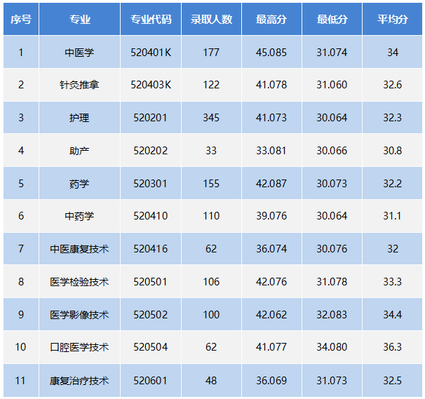 按照省教育厅、省教育考试院的统一安排,我校圆满完成2024年普通高中生综合评价招生任务。我校共有中医学、针灸推拿、护理、医学检验技术等11个专业参加此次录取,录取学生1320名。录取最高分45.085分、最低分30.064分,平均分32.854分。