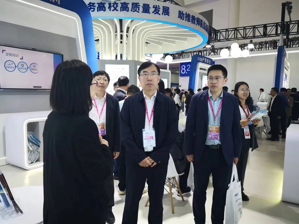 校长郝文斌及学校相关部门负责人,主要考察学习了“高校专区”和“高新装备展区”及“特色专区”,并围绕“AI+教育 全面发展高校新质生产力”“智慧教育”“高校探索数字化转型”等主题,与参展高校及高新装备企业负责人进行深入交流。