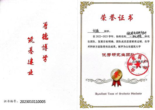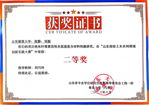 该团体成员近年来共发表高水平论文7篇,授权发明专利4项,计算机软件著作权1项。该团体成员在第六届全国大学生混凝土材料设计大赛中荣获一等奖。在第三届3D打印混凝土材料与结构国际会议上,团体成员作了题为“纳米纤维素对水泥基材料流变性能的影响”的报告并荣获二等奖。在山东高校土木水利领域创新实践大赛中,团体成员作了题为“纳米纤维素改性水泥基复合材料性能研究”的报告并荣获二等奖。此外,该团体成员积极参与大学生竞赛,取得了第七届山东省“互联网+”大赛银奖、山东省大学生创客大赛三等奖、山东建筑大学“优秀研究生”团队等荣誉。