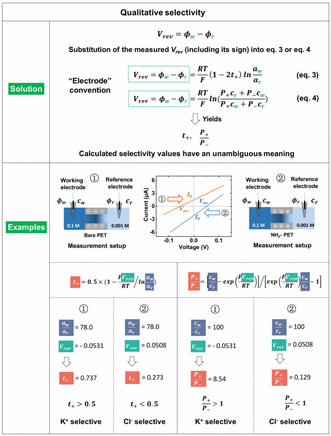 离子选择性是生物蛋白孔和仿生固态纳米孔的重要特征,是设计生物传感、离子筛分、渗透能转换等器件的理论基础。定量分析纳米孔的离子选择性对设计和提高其性能至关重要。相对于其他的测量方法,膜电位法因其独特的优点而被广泛应用。膜电位法需要利用Nernst或Goldman−Hodgkin−Katz(GHK)方程去解释测量的跨膜电势从而得到离子选择性,然而这些公式的传统形式并没有体现跨膜电势的方向性,在实际计算中研究者通常使用跨膜电势的绝对值去计算离子选择性,这就需要知道纳米孔道的表面电性去判断其选择运输的离子,解释公式计算的离子选择性。此外,研究者通常选择Nernst或Goldman−Hodgkin−Katz(GHK)公式去计算离子选择性,而忽略了这两个公式的前提假设,错误的理解公式计算的有效选择性,并在不同的测量条件下比较不同器件离子选择性。
