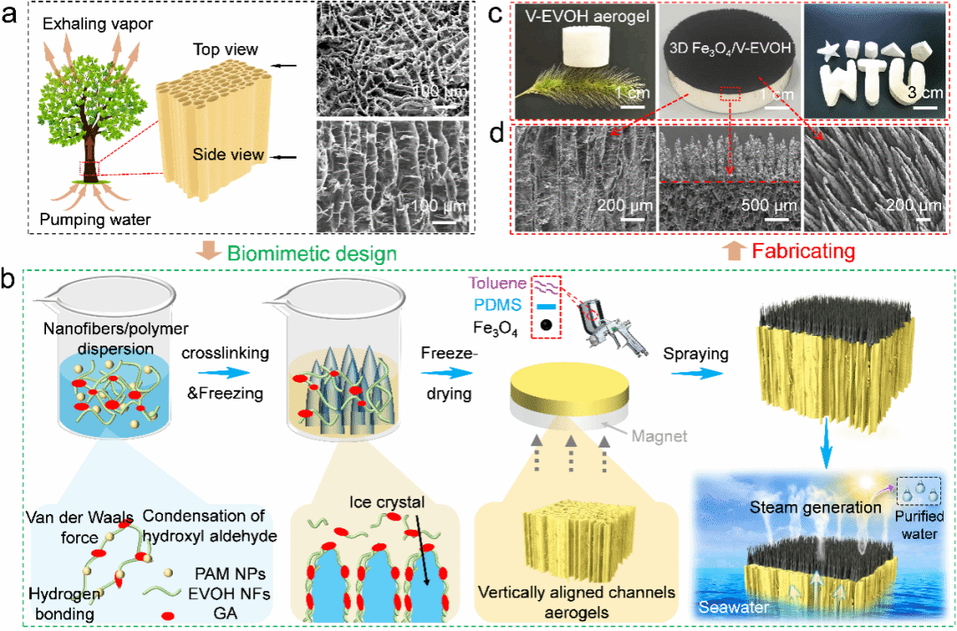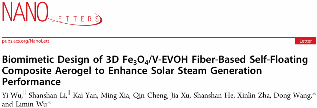 近日,我校纺织纤维及制品教育部重点实验室王栋教授团队的武艺副教授在国际顶级期刊Nano Letters上发表题为“Biomimetic Design of 3D Fe3O4/V-EVOH Fiber-Based Self-Floating Composite Aerogel to Enhance Solar Steam Generation Performance”的高水平研究论文。武汉纺织大学为论文第一署名单位,论文第一作者为纺织纤维及制品教育部重点实验室武艺副教授,硕士生李珊珊为共同第一作者。通讯作者为武汉纺织大学王栋教授和复旦大学武利民教授。