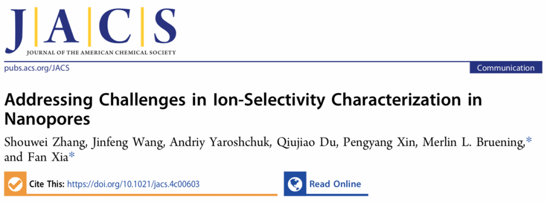 近日,我校先进纺纱织造及清洁生产国家地方联合工程实验室王金凤教授团队张守伟博士在Journal of the American Chemical Society上以Communication发表题为“Addressing Challenges in Ion-Selectivity Characterization in Nanopores”的高水平研究论文。武汉纺织大学为论文第一署名单位,论文第一作者为国家地方联合工程实验室张守伟博士。美国圣母大学(University of Notre Dame, USA)Merlin L. Bruening教授和中国地质大学(武汉)夏帆教授为通讯作者。