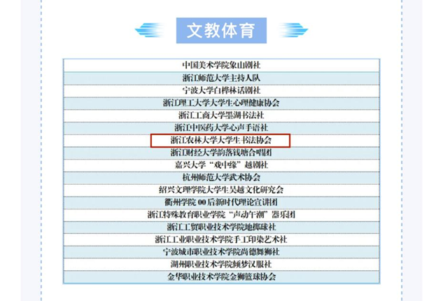 为进一步激发高校学生社团活力,充分发挥学生社团育人功能, 团浙江省委学校部、浙江省学联组织开展省级“活力社团”风采展示活动,经学校审核推报,结合抖音“活动落地页”情况与日常工作了解,发布了2023-2024学年浙江省高校“活力社团”TOP100榜。我校大学生青鸢生态科考协会(科技创新)、大学生书法协会(文教体育)、大学生昆虫爱好者协会(绿色发展)入选。