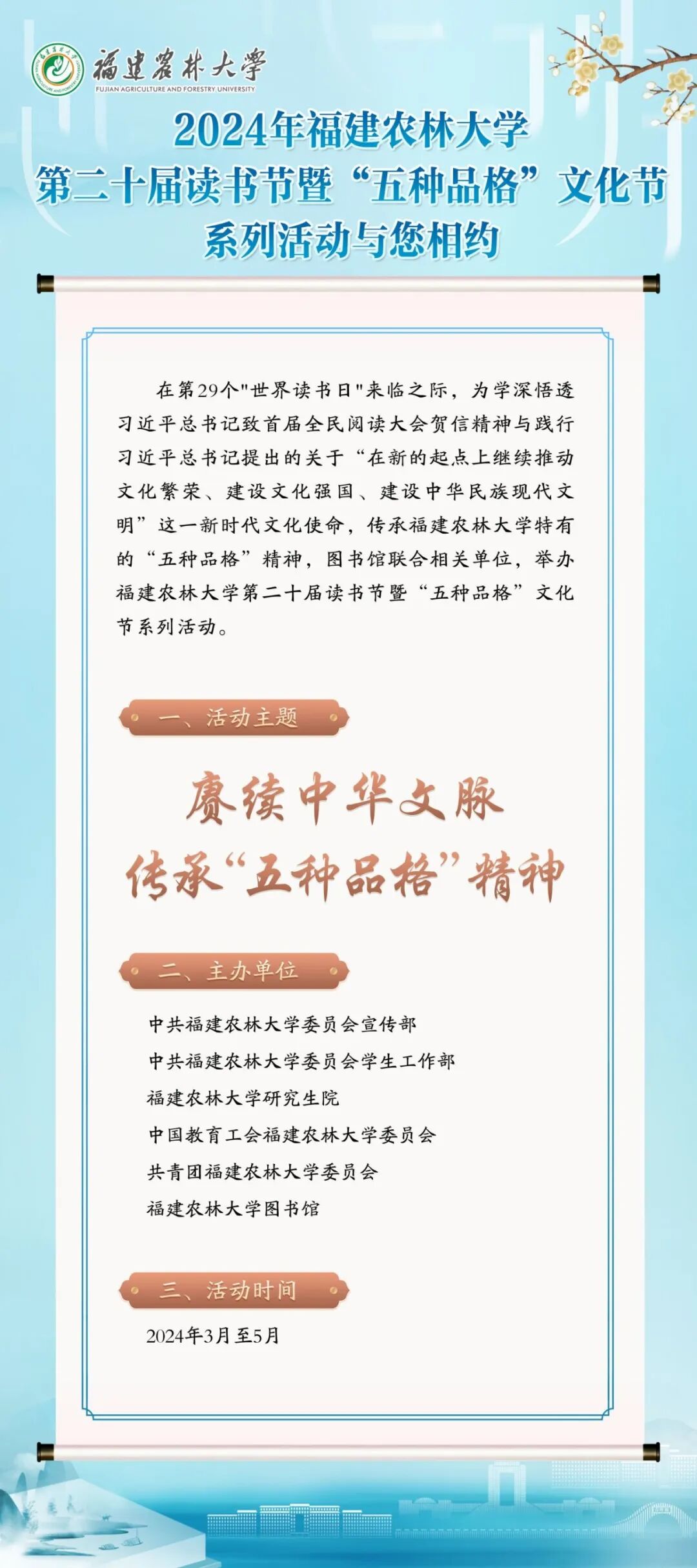 最美人间四月天,正是读书好时节。习近平总书记指出:“青年处于人生积累阶段,需要像海绵汲水一样汲取知识。”广大青年应当抓住读书学习的黄金时期,通过阅读充实自我、提升本领、增长才干。值此第29个世界读书日之际,图书馆联合相关单位,举办福建农林大学第二十届读书节暨“五种品格”文化节系列活动,让我们以书为媒,共建书香校园。